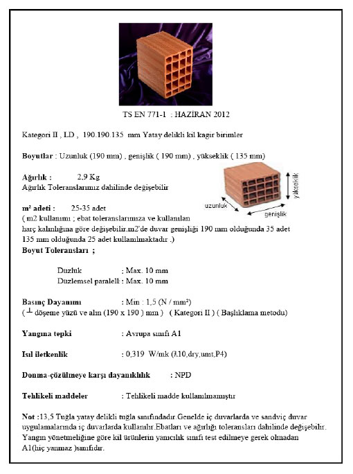 Ağırlık : 2,90kg.Kullanım Adedi : 35 adet m2Ebatlar : 19x10x13,5 cm.Garanti : TSE-CEPaletdeki Adedi : 315 Adet